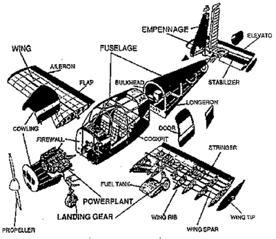 There are several parts of an airplane. To simplify, a plane can be divided into five major sections identified below: 1) the powerplant includes the engine and propeller which create thrust; 2) the airfoils or wings include the ailerons and flaps which create lift; 3) the fuselage is the main body of the plane and carries weight; 4) the empennage includes the tail, stabilizers and/or elevators for keeping the plane flying straight; and 5) the landing gear includes the wheels, brakes and shocks.