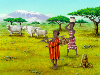 My name is Mbweha and my sister's name is Ndoto. We are nomads, part of the Masai tribe, who travel from the steep cliffs of Mt. Kilimanjaro to the low-land plains of Masi-Mara in the serengeti of northern Tanzani. We are known for our power, our strength, and our bravery. We make and produce everything we need for the trek with our herds across the plains. Providing for our community or kraal is our livelihood, as is our cattle. My people believe that cattle were given to us for safe keeping by our god. We believe that we are to be one with both the wild and the tame animals about our surroundings.