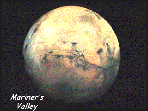 Here, the Mariners Valley is seen from almost directly above. Notice, also, the three Tarsus volcanoes on the limb of the planet to the left of the image.