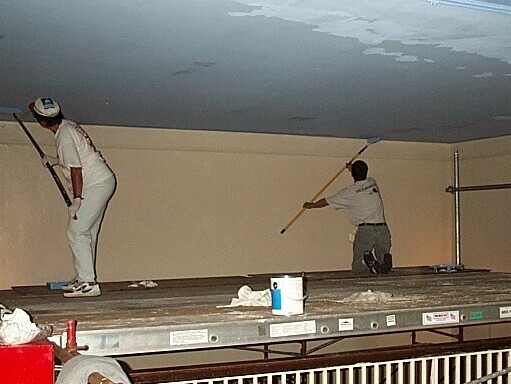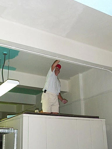 A PD staff member paints the third floor ceiling while standing on a practice module.