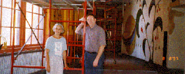 | The Friends of CSA's Director of Development and CSA's Principal Earl Cohen pose by a scaffold before the painting and repairs to the first floor began. |