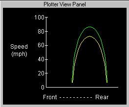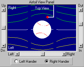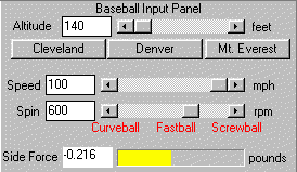 As the speed is increased, the flowing streamlines in the view window will appear to speed up. As spin is put on the ball, the view window will show the ball's rotation and the (slight) deflection of the streamlines. Spinning the ball creates a side force ("Magnus" effect) which causes the ball to curve in flight. The magnitude of the side force is shown in the output box and horizontal gauge at the bottom of the input panel. The direction is color-coded to correspond with the view window.
