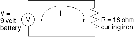 A nine volt battery supplies power to a cordless curling iron with a resistance of 18 ohms. How much current is flowing through the curling iron?