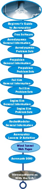 Link to Videoconferences with the U.K. Link to Aerodynamics General Information and Free Java Software Link to Wind Tunnel Homepage Link to Aeronautics Lessons and Activities Link to Propulsion Problem Sets Link to Foil Sim Problem Sets Link to Engine Sim General Information and Free Java Software Link to Engine Sim Problem Sets Link to ModelRocketSim Link to Foil Sim General Information and Free Java  Software Link to Aeronauts 2000 Link to Beginner's Guide to Aeronautics Link to Propulsion General Information and Free Java Software Link to Aerodynamics Problem Sets LInk to Free Software