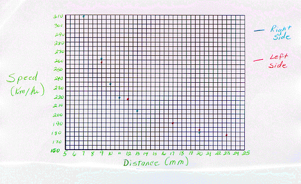 By moving only the left slider in the Probe Control Panel move the probe to the right of the ball and take five readings of distance and speed. Record these in the chart below. Repeat this for five readings to the left of the ball.