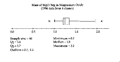 Students burned known mass samples of magnesium in crucibles. Mass of magnesium oxide was determined after the combustion. Mass ratio of magnesium oxide to magnesium was listed for each of the four classes in a graphing calculator. Data analyzed statistically by finding median, range, Q1, Q2, Q3, mean and standard deviation.