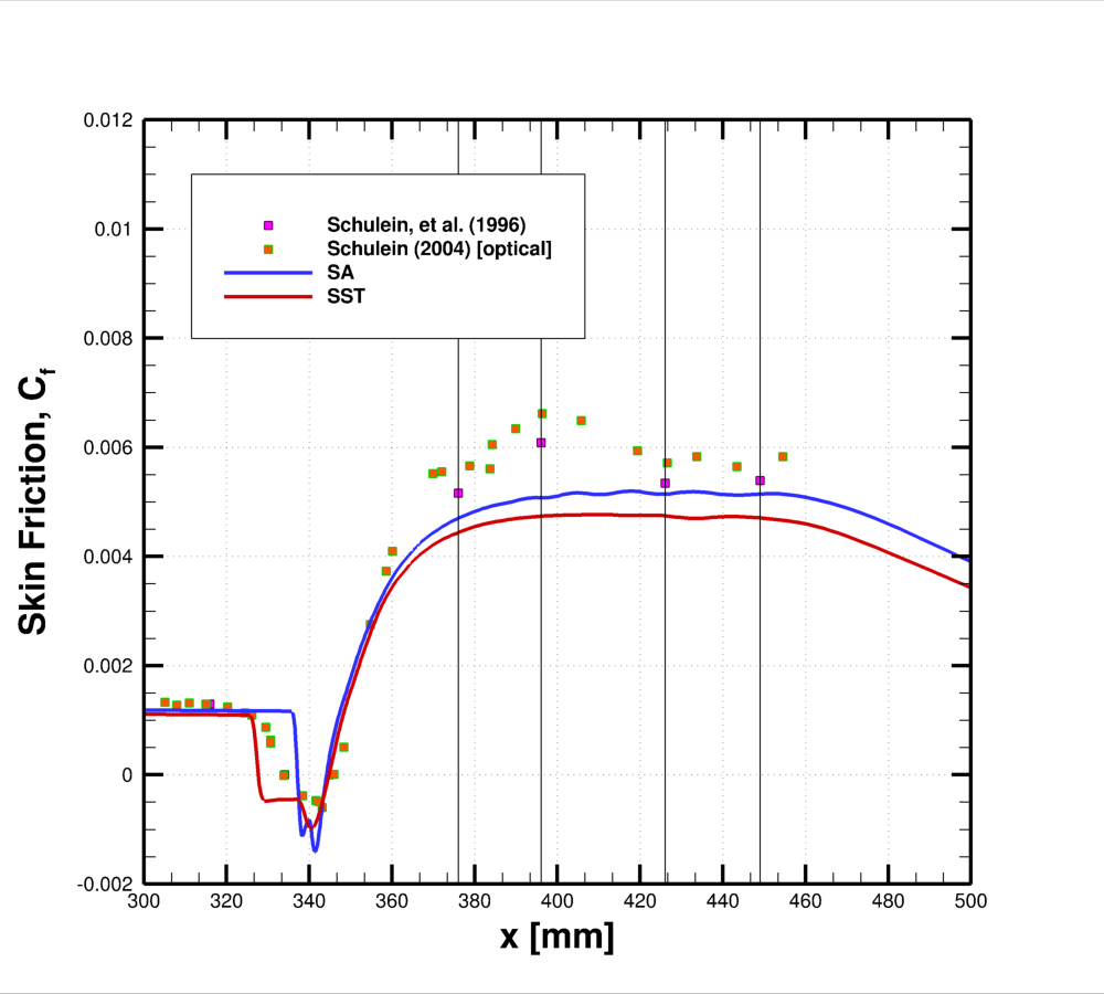 Experimental skin friction and u-velocity data is available for comparison. However, only comparison with skin friction data is presented below due to restrictions on dissemination of the velocity data. The post processing scripts, regardless of the unavailability of the experimental velocity data, extracts calculated velocity data for turbulence model comparisons.