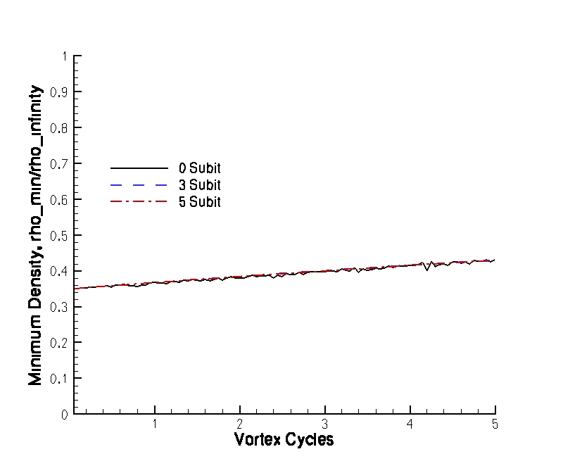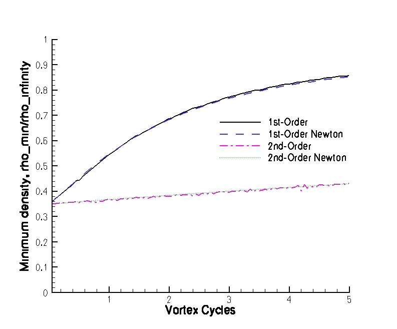 Figure 5. Vortex minimum density. Global Newton cases used 5 subiterations.