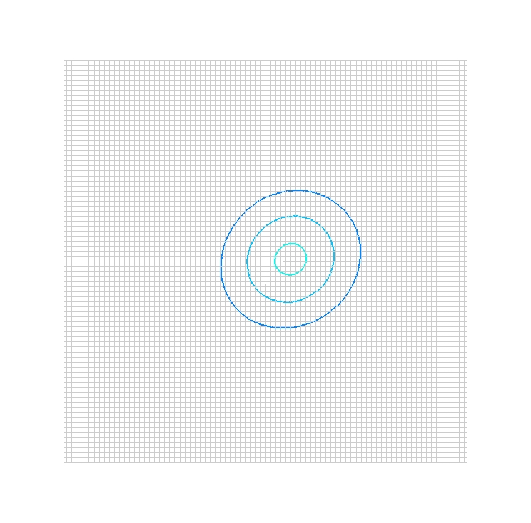In this test case, an inviscid vortex is convected through a square domain with periodic boundary conditions. The initial position of the vortex is in the center of the grid, as shown in Figure 1a. The vortex has strength &Gamma = 5 and is allowed to convect downstream in Mach 0.5 flow with a nondimensinal time step of 0.1. The vorticity of the vortex is described by &omega = [&Gamma(2-R)/2&pi]{exp[0.5(1-R)]}, where R = (x-x0)2 + (y-y0)2, and x0 and y0 describe the vortex center. The grid is given periodic boundary conditions in the flow direction, which is from left to right. The vortex should complete one flow cycle on the grid every 200 time steps.