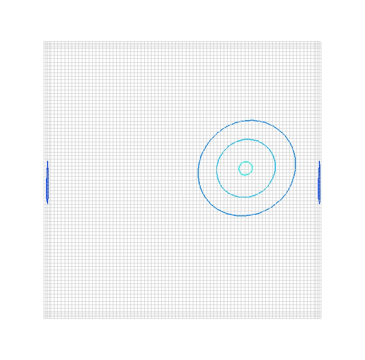 The initial flow conditions are generated by the program makeq.f, which generates the initial vortex on the above grid, mkgrid.fmt.x and writes a Plot3d solution file (formatted, single-zone,whole, three-dimensional) named vortexic.fmt.q for the initial solution. This Plot3d solution file is converted to the common solution file (*.cfl) format using the CFCNVT utility. This is done using the command