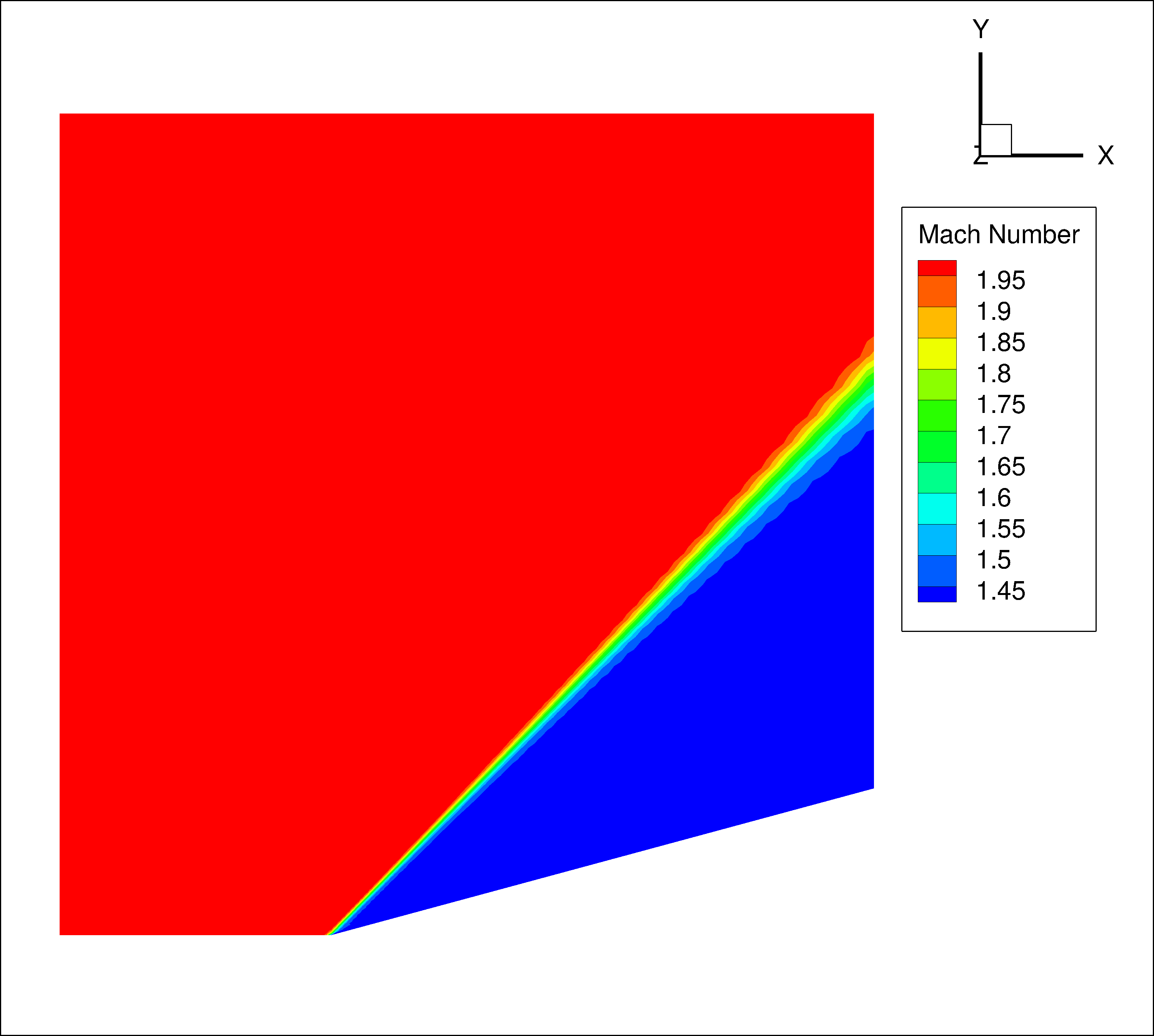 The freestream boundary condition was used for the inflow and upper boundaries. The freestream Mach number was 2.0 and standard atmospheric pressure and temperature were used. At the downstream plane, an outflow boundary with pressure extrapolation was used. The lower boundary used inviscid walls, to simulate both the plane of symmetry on the upstream portion and the inviscid wedge surface on the angled portion.