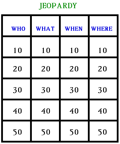 5. Divide students into teams. One student from each team is chosen as captain to answer the questions. (Or each team member can take a turn) The team that answered correctly can select the next category and amount (or select amounts in order). The teacher reads the question, and students can ring in or raise their hands.