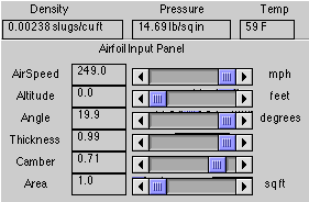 Using FoilSim, set the control panel as shown in Figure 1. ![]() Figure 1 Use command-shift-3 (on a Macintosh) or use the "print screen" or "prtscr" button (on Windows) to screen-capture the page. Paste the graph in a word processing or paint document. Crop the picture so that just the graph remains as shown in Figure 2. Use the printing options to enlarge and print the graph. ![]() Figure 2 Be careful with scaling. Since the "Area" setting in the FoilSim control panel was set at 1 sq.ft., the curves displayed (not the axis) will be from "0" to "1." Draw narrow rectangles with equal widths across the region bounded by the curves (as shown in Figure 3) and find the area of each. (Be careful with the scaling.) Create a table and record this information. ![]() Figure 3 The total area between the curves is the sum of the individual areas; this value represents the lift force. Compare your value to the value given by FoilSim. Using the same graph, draw a straight line along the curves as shown in Figure 4. ![]() Figure 4 Find the slopes of each line and use them to find the respective equations. Use integration techniques to find the area of the enclosed region; this value represents the lift force. Compare your value to the value given by FoilSim and to your previous value. |