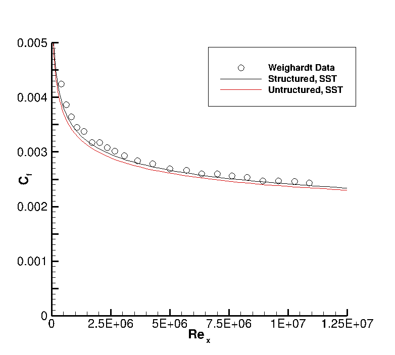 Monitoring the residuals and key flow field quantities, for this case the wall skin friction coefficient, were the methods of determining convergence of this case. Below are the algorithm settings used in the dat file for these unstructured solver cases. Note that settings for the structured solver (i.e. choice of RHS method) were different, and may be found on the structured solver page for this flat plate case.