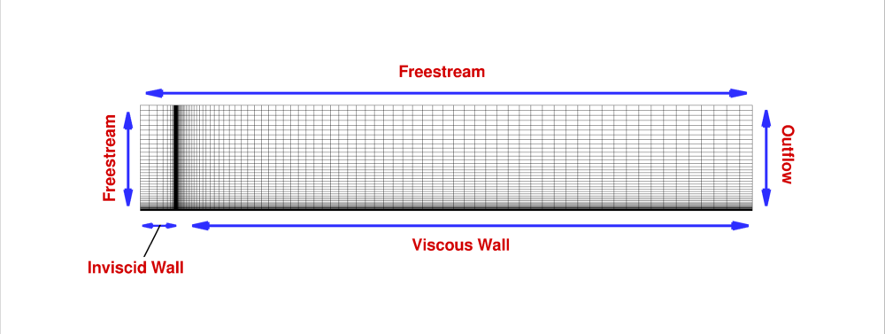 Boundary conditions for this flat plate case are as shown in Figure 2. Note that the first 14 points along the bottom are set to inviscid, such that the leading edge of the plate is at grid point 15 in the axial direction along the bottom of the grid. Although only the hexahedral or "structured" grid is shown in the figure, the boundary conditions are the same for the other grid, having triangular prisms away from the wall.
