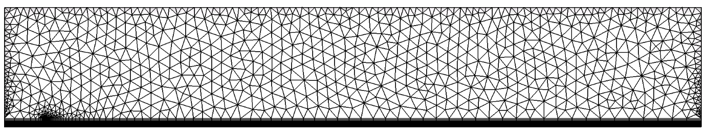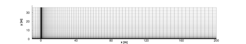 In Figure 1a, the same structured grid as that used for the structured grid validation is shown. The grid has 111 points in the axial direction and 81 points in the vertical direction. The grid was packed to the wall such that the first point corresponded to a y+ value of 1 or less. Note the y+ spacing study shown on the structured grid flat plate boundary layer test case page. For use with the unstructured solver, the individuals cells are hexahedrals. In the rest of the discussion on this webpage, "structured" grid refers to this hexahedral grid that indeed looks structured but is in fact saved in unstructured hexahedral cell format. In Figure 1b and 1c, a modified grid is used where the first 51 points away from the wall are retained as the original "structured" hexahedral cells, and then away from this region, the cells are triangular prisms. The entire grid is one cell wide in the z-direction.