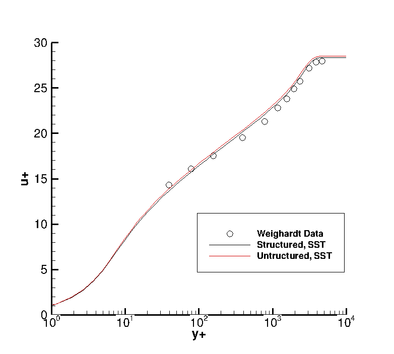 This case examines the boundary layer formation of a Mach 0.2 flow along a flat plate. Skin friction and y+ plots of the boundary layer were studied in this case. This case is analogous to that used for the structured grid flat plate validation.
