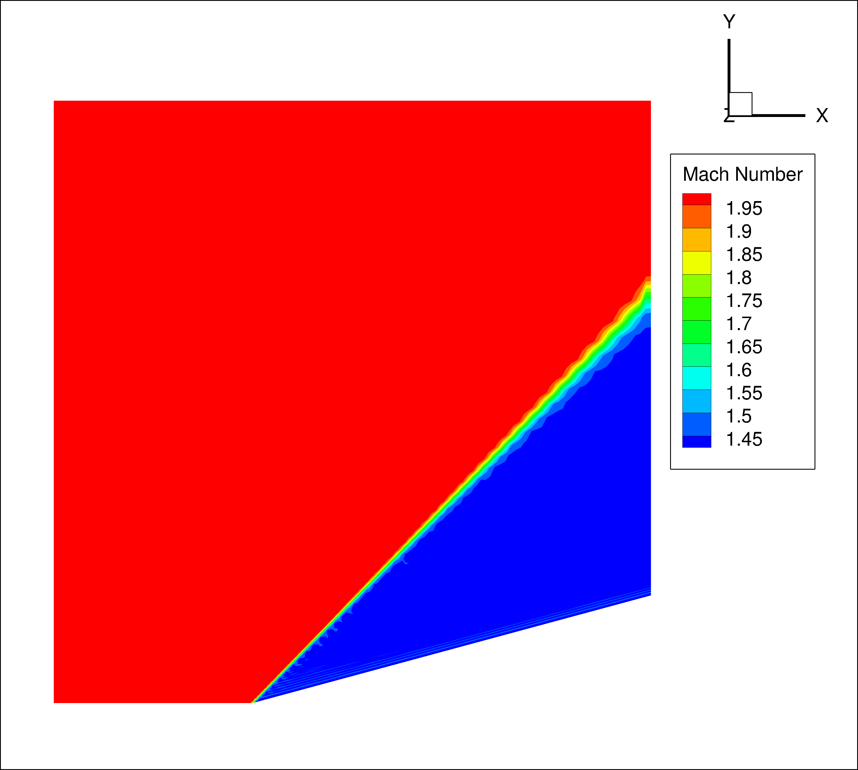 The freestream boundary condition was used for the inflow and upper boundaries. The freestream Mach number was 2.0 and standard atmospheric pressure and temperature were used. At the downstream plane, an outflow boundary with pressure extrapolation was used. The lower boundary used inviscid walls, to simulate both the plane of symmetry on the upstream portion and the inviscid wedge surface on the angled portion.