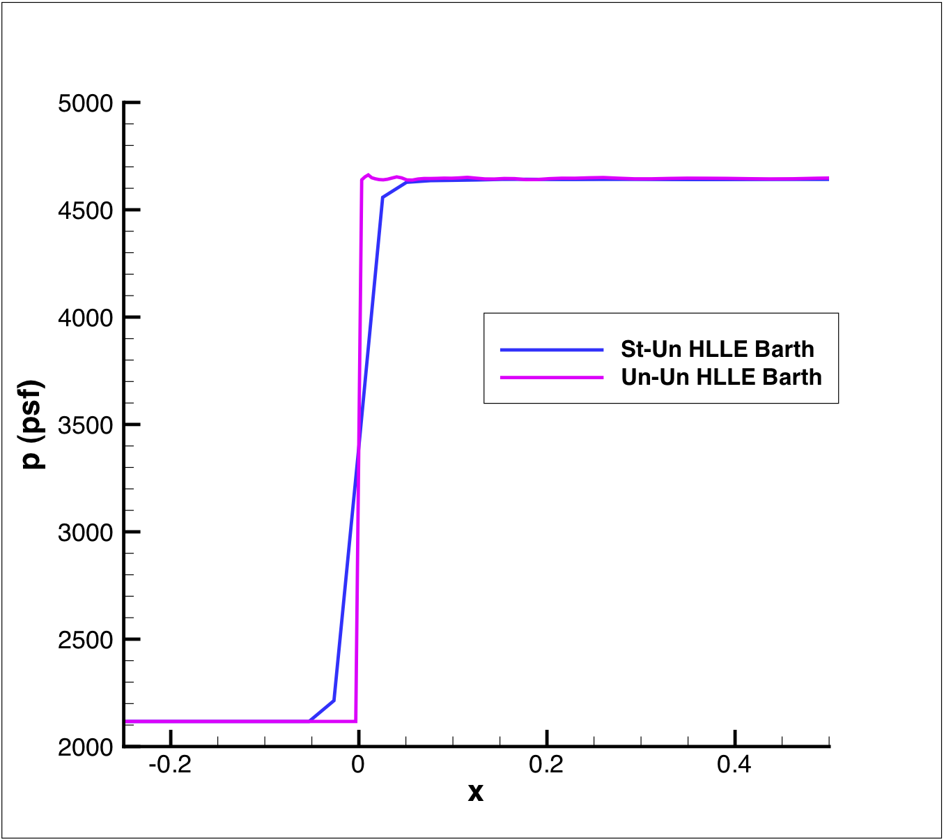 The effect of the grid type and grid distribution can be seen in figure 5. Both the structured and unstructured grid were run using the unstructured solver. Both solutions used the HLLE right-hand side and Barth TVD limiter. The solution using the unstructured grid has a sharper discontinuity, less shock smearing. This effect is due to the fine resolution of the shock region with the unstructured grid and demonstrates the added flexibility inherent in unstructured simulations. It is anticipated that a structured grid tailored to resolve the shock wave would yield a similar solution.
