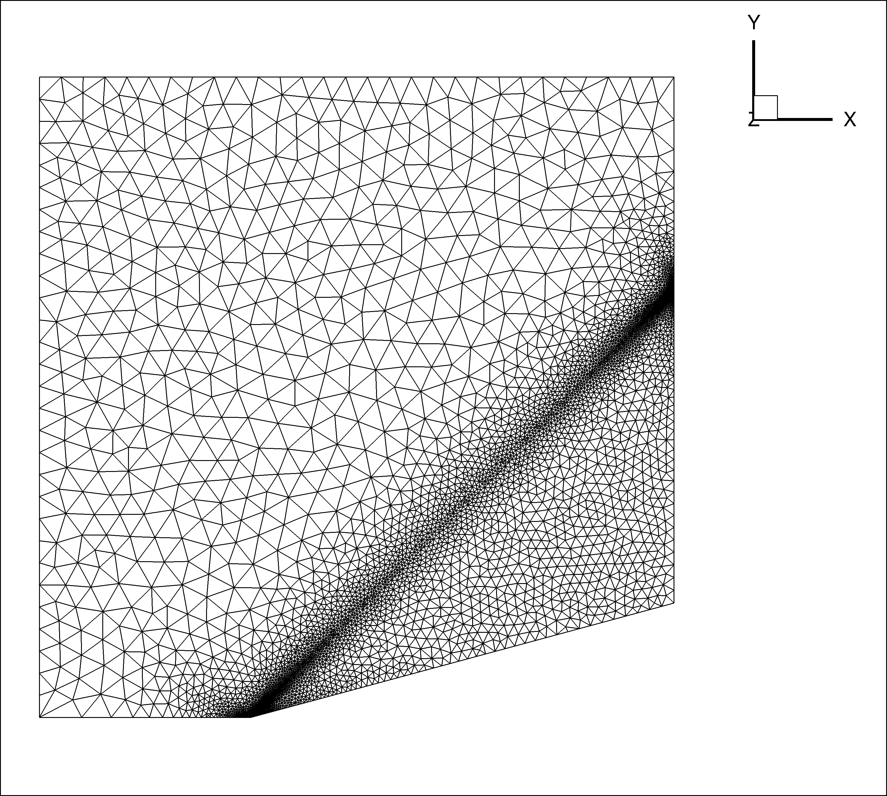 The unstructured grid consists of 5,202 nodes in the 2D plane. The shock position was computed using inviscid theory and grid points were clustered around this line. The resulting plane is extruded one plane in the third direction to create the three-dimensional grid, one cell wide.