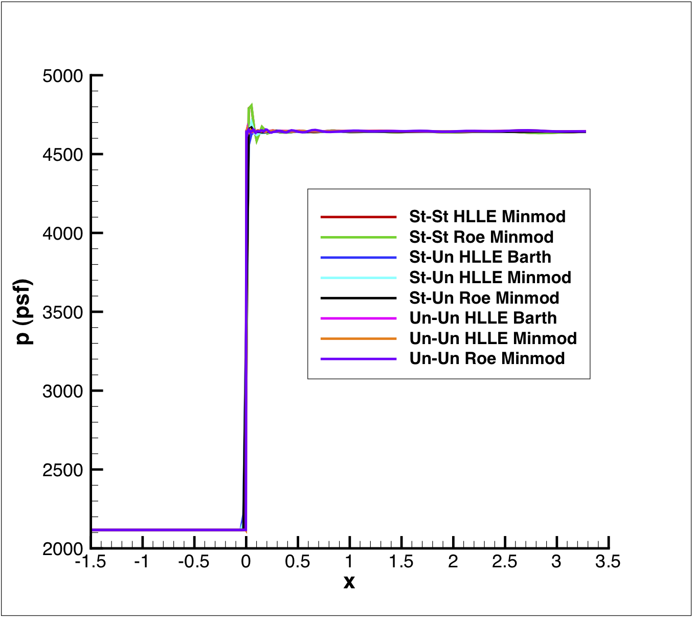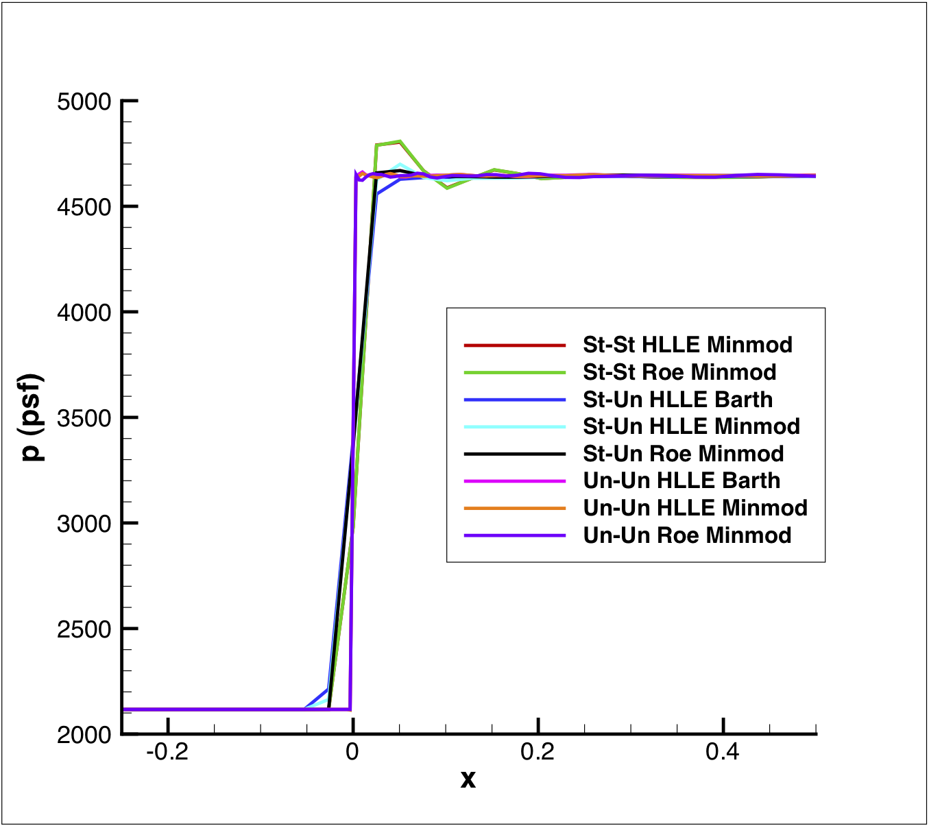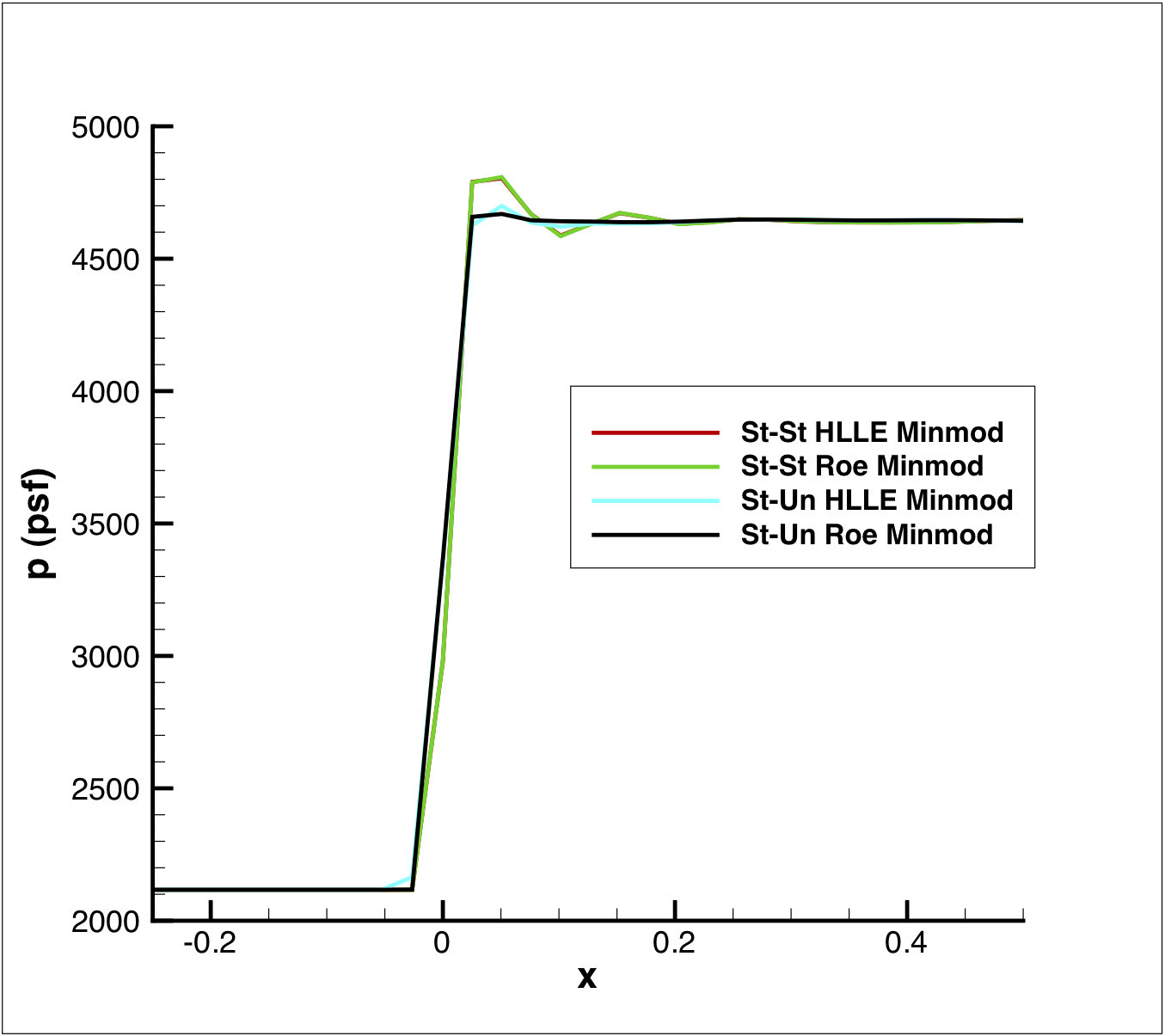 The accuracy of the structured and unstructured solvers are compared using the structured grid (figure 6.) Both the HLLE and Roe schemes are compared using the minmod TVD limiter. All the solutions are very similar, with the exception of the structured solver's Roe scheme, which produces a stronger post-shock oscillation.